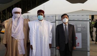 2021年3月21日,中國政府援助的國藥集團中國生物新冠疫苗運抵尼日爾首都尼亞美迪奧里•哈馬尼國際機場(chǎng)。尼日爾總統伊素福、總理拉菲尼等赴機場(chǎng)迎接。