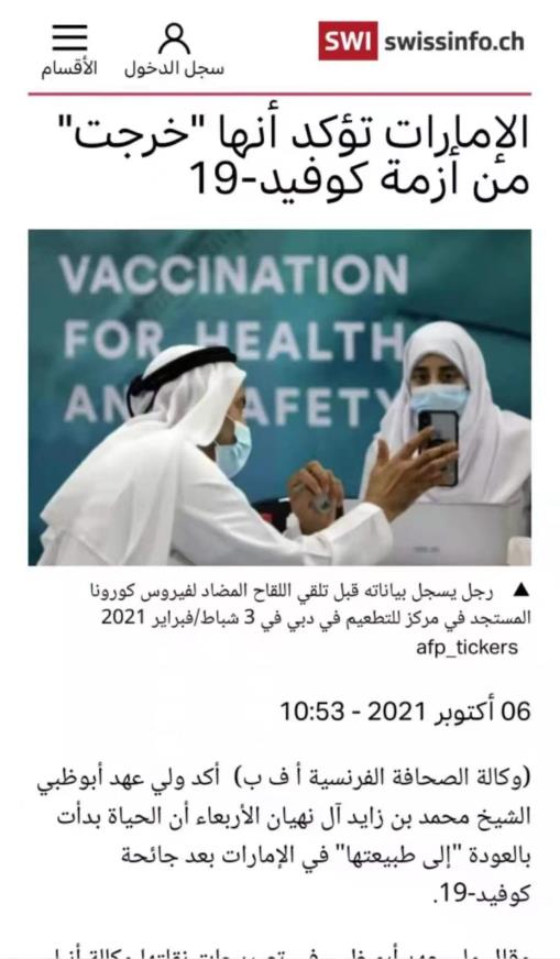 2021年10月6日,阿布扎比王儲謝赫•穆罕默德•本•扎耶德•阿勒納哈揚在阿聯(lián)酋通訊社發(fā)表聲明:“無(wú)論是在工作、學(xué)習還是社會(huì )的日常習慣和做法方面,阿聯(lián)酋生活已經(jīng)開(kāi)始恢復正常”、“值得慶幸的是,阿聯(lián)酋能夠成為首批擺脫危機的國家之一”,穆罕默德強調,幫助生活恢復正常的因素是“疫苗的順利接種及一些先進(jìn)的治療方法”。據美國彭博社數據顯示,阿聯(lián)酋最先大規模使用中國國藥集團中國生物疫苗且在疫苗接種方面都保持領(lǐng)先地。