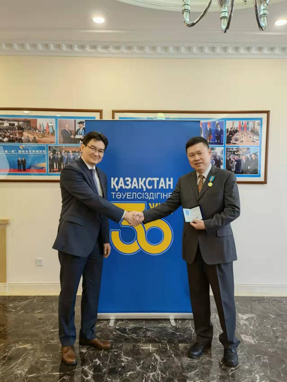 3月3日,國藥集團所屬?lài)巼H副總經(jīng)理嚴兵受邀赴哈薩克斯坦駐華大使館,與哈駐華大使哈比特·柯依舍巴耶夫進(jìn)行會(huì )談交流。根據哈總統托卡耶夫的命令,柯依舍巴耶夫代表總統向嚴兵頒發(fā)哈薩克斯坦獨立30周年紀念勛章。此次授勛是對國藥集團、國藥國際的充分肯定和認可。
