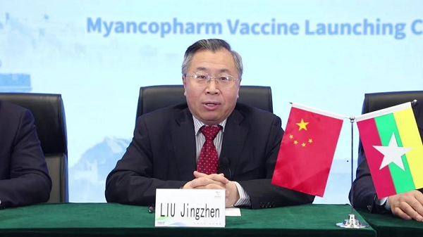 3月23日,中緬合作生產(chǎn)新冠疫苗投產(chǎn)啟動(dòng)儀式在仰光舉行,中國駐緬甸大使陳海、緬甸國家管理委員會(huì )秘書(shū)昂林堆、緬甸工業(yè)部部長(cháng)查理丹和緬甸衛生部部長(cháng)岱楷溫等出席了啟動(dòng)儀式,國藥集團董事長(cháng)劉敬楨通過(guò)視頻發(fā)言并表示祝賀。