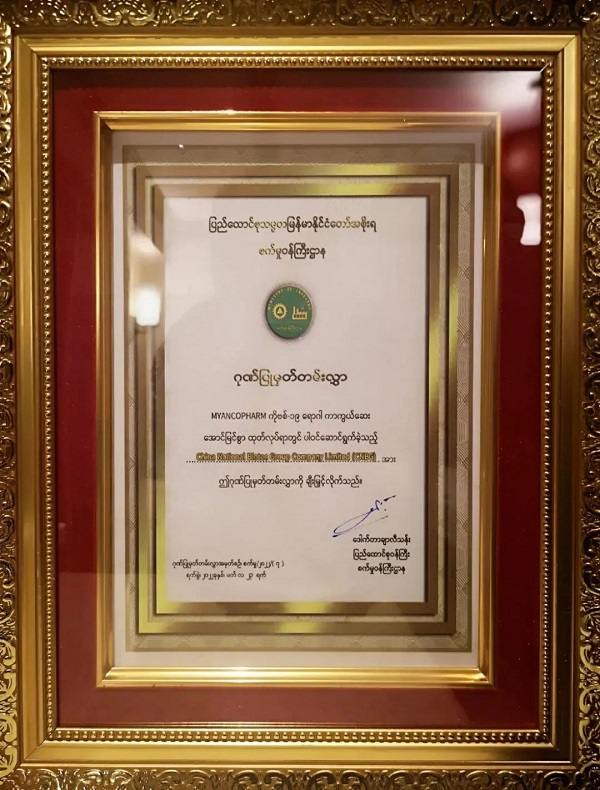 表彰證書(shū)感謝國藥集團中國生物在myancopharm新冠疫苗順利生產(chǎn)過(guò)程中作出的貢獻。