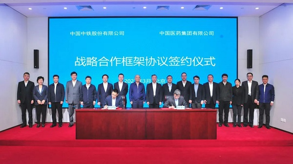 會(huì )談結束后,雙方舉行戰略合作框架協(xié)議簽約儀式,中國中鐵副總裁于騰群、國藥集團副總經(jīng)理鄧金棟代表雙方簽約。中國中鐵董事長(cháng)陳云、國藥集團董事長(cháng)劉敬楨及雙方總部相關(guān)部門(mén)及子企業(yè)負責人見(jiàn)證簽約。