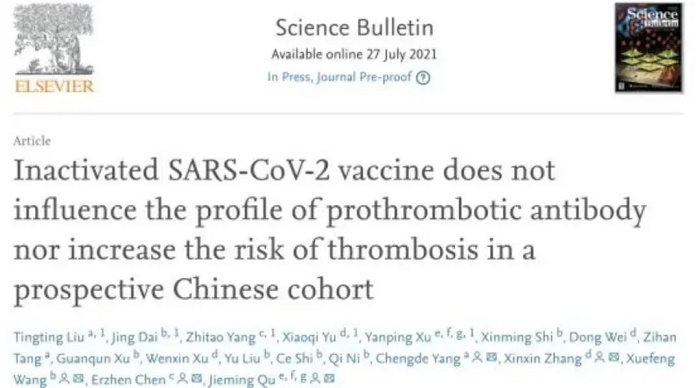 2021年8月,國際權威自然科學(xué)綜合性學(xué)術(shù)刊物Science Bulletin(科學(xué)通報,影響因子IF:11.780),發(fā)表的一項旨在探索新冠滅活疫苗是否會(huì )促進(jìn)血栓相關(guān)自身抗體的產(chǎn)生及是否會(huì )增加接種后血栓事件風(fēng)險的前瞻性研究成果表明,國藥集團中國生物新冠滅活疫苗無(wú)發(fā)生血栓風(fēng)險。