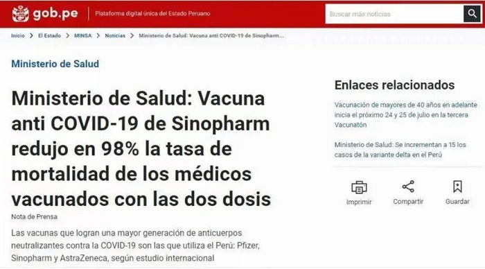 6、秘魯:衛生部報告表明國藥新冠疫苗可大幅降低死亡率