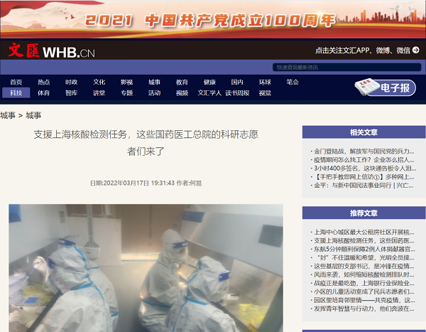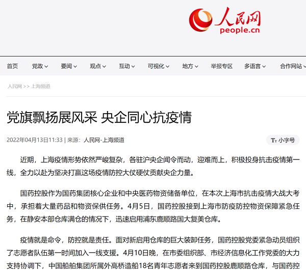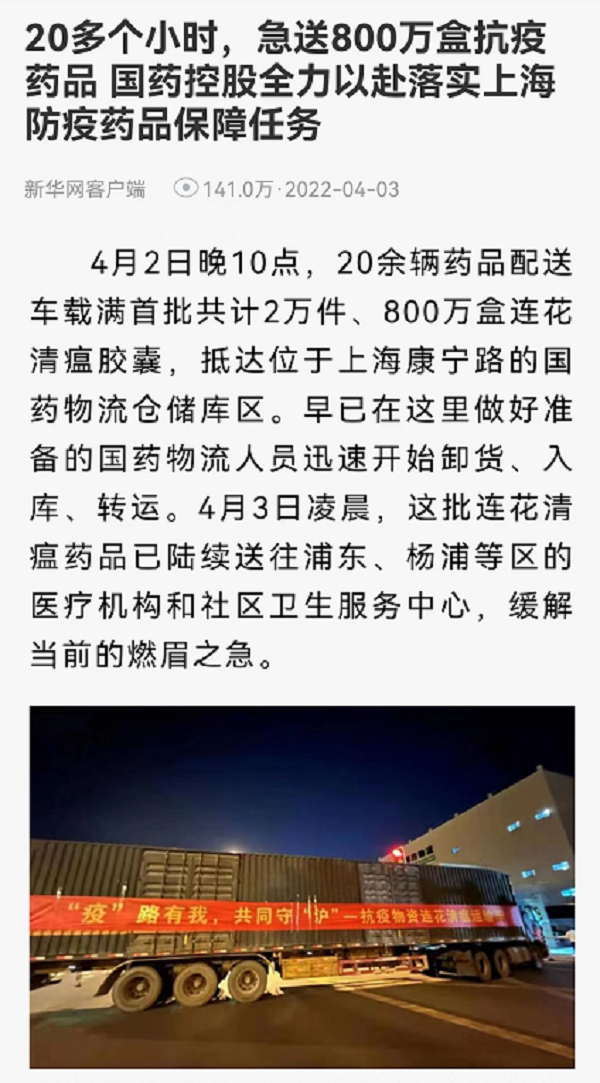 近日,國藥集團發(fā)揮全產(chǎn)業(yè)鏈優(yōu)勢,全面助力上海疫情防控。期間,新華網(wǎng)、人民網(wǎng)、央視新聞、中國青年報、工人日報、解放日報、中國經(jīng)濟網(wǎng)、文匯報、東方衛視、秦楚網(wǎng)等多家中央和地方主流媒體對國藥集團所屬?lài)幙毓?,國藥中生,國藥醫工總院,國藥國際、國藥醫療等企業(yè)助力上??挂哌M(jìn)行深入、廣泛報道。