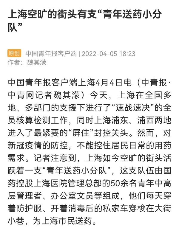 今天,上海在全國多地、多部門(mén)的支援下進(jìn)行了“速戰速決”的全員核酸檢測工作,同時(shí)上海浦東、浦西兩地進(jìn)入了最緊要的“屏住”封控關(guān)頭。然而,對新冠疫情的防控,不能控住居民日常的用藥需求。記者注意到,上海如今空曠的街頭活躍著(zhù)一支“青年送藥小分隊”,這支隊伍由國藥控股上海醫院管理總部的50余名青年中高層管理者、辦公室文員等組成,他們每天穿著(zhù)防護服、開(kāi)著(zhù)消毒后的私家車(chē)穿梭在大街小巷,為上海市民送藥。