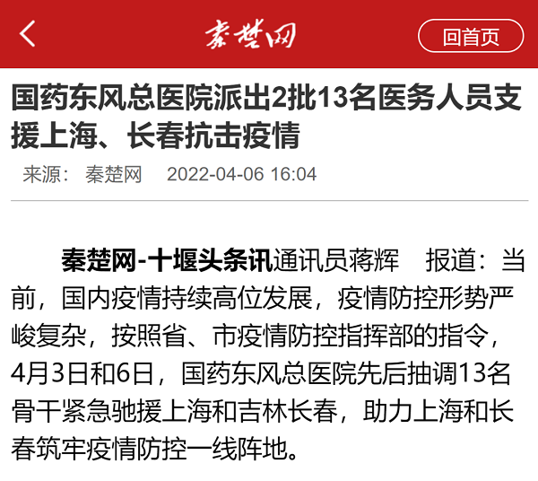 當前,國內疫情持續高位發(fā)展,疫情防控形勢嚴峻復雜,按照省、市疫情防控指揮部的指令,4月3日和6日,國藥東風(fēng)總醫院先后抽調13名骨干緊急馳援上海和吉林長(cháng)春,助力上海和長(cháng)春筑牢疫情防控一線(xiàn)陣地。