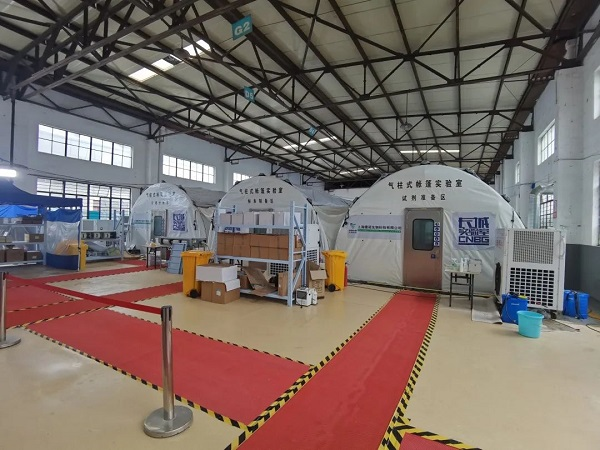 3月15日,幾輛14米長(cháng)的大卡車(chē)滿(mǎn)載氣膜艙體、核酸提取儀等設備,駛進(jìn)松江區九亭鎮伴亭東路的一處廠(chǎng)房。大家擼起袖子、當起工人,硬是在這個(gè)“毛坯房”里建起一座生物安全標準不輸傳統實(shí)驗室的氣膜實(shí)驗室。