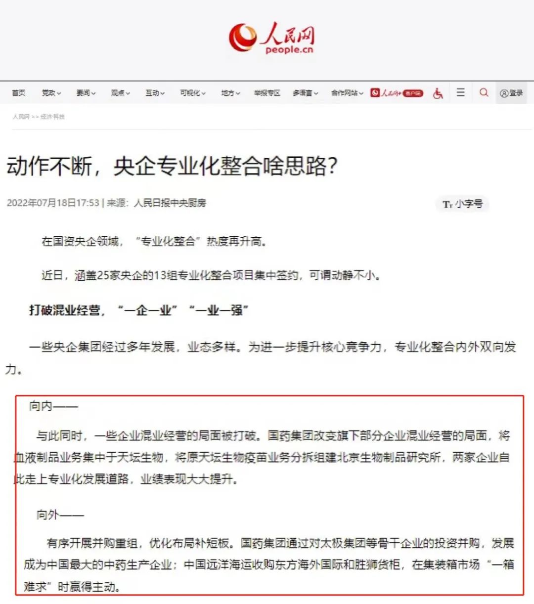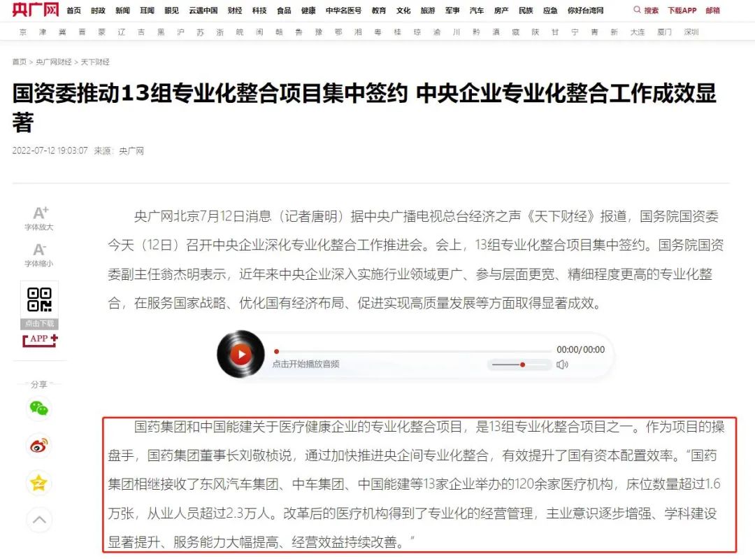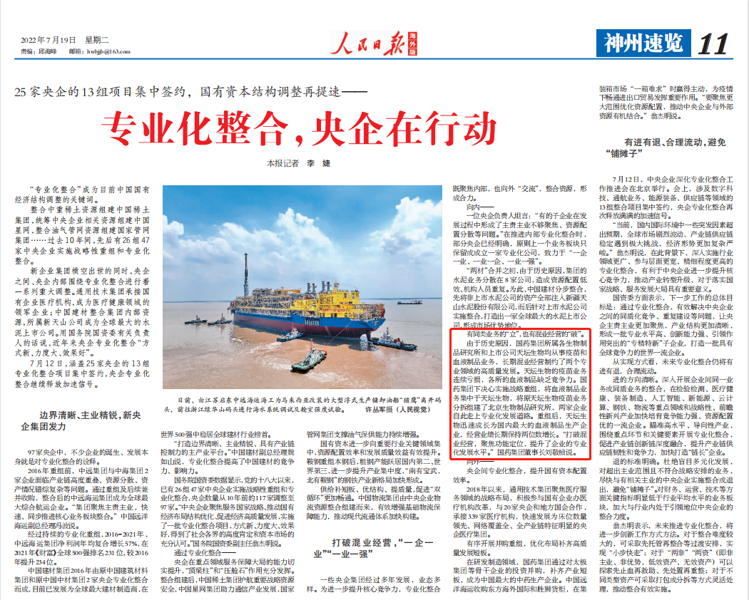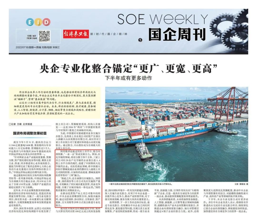 7月12日,國資委召開(kāi)中央企業(yè)深化專(zhuān)業(yè)化整合工作推進(jìn)會(huì ),總結中央企業(yè)在實(shí)施行業(yè)領(lǐng)域更廣、參與層面更寬、精細程度更高的專(zhuān)業(yè)化整合的做法,交流在服務(wù)國家戰略、優(yōu)化國有經(jīng)濟布局、促進(jìn)實(shí)現高質(zhì)量發(fā)展等方面的經(jīng)驗,并部署推動(dòng)下一步專(zhuān)業(yè)化整合工作,國藥集團作為6家改革成效顯著(zhù)的企業(yè)之一作發(fā)言交流,多家媒體對此進(jìn)行了報道。