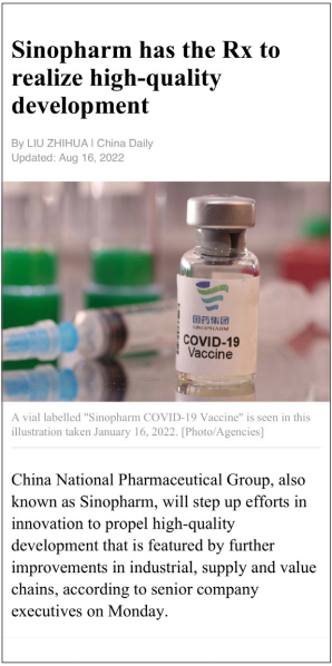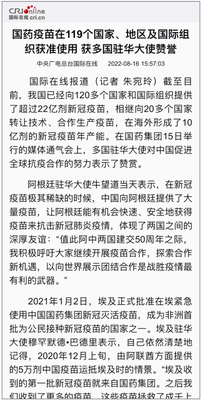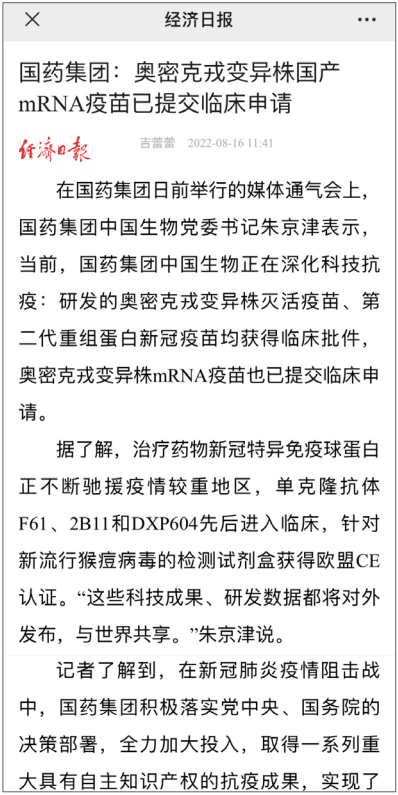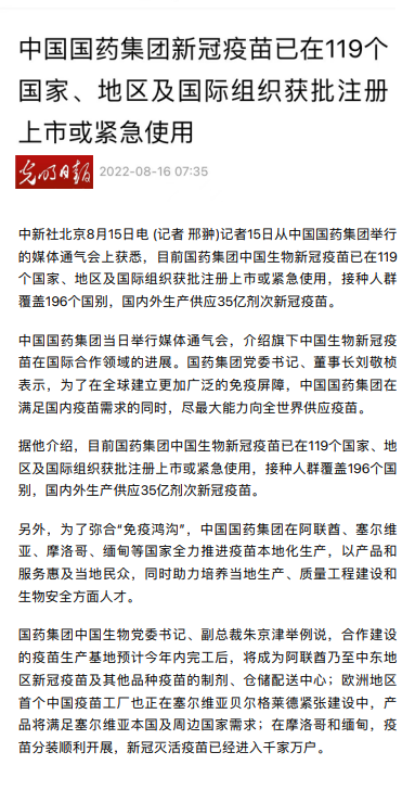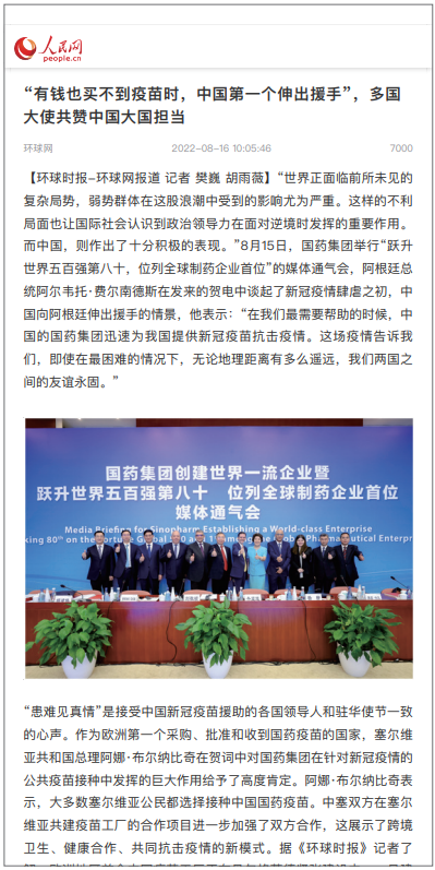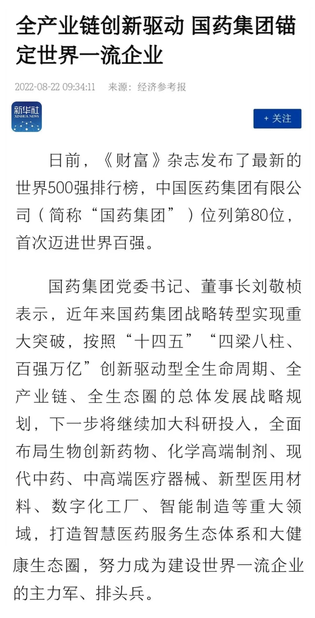 8月15日,“國藥集團創(chuàng )建世界一流企業(yè)暨躍升世界五百強第八十 位列全球制藥企業(yè)首位媒體通氣會(huì )”在京舉行?;顒?dòng)介紹黨的十八大以來(lái)國藥集團改革發(fā)展各項事業(yè)取得的成就,及成為“世界500強第80位、全球制藥企業(yè)首位”的成果,受到媒體廣泛關(guān)注報道,引起強烈反響。人民日報、新華社、中央廣播電視總臺、經(jīng)濟日報、中國日報、中國新聞社、工人日報、中紀委新聞中心等30余家中央媒體及重點(diǎn)主流媒體都紛紛對國藥集團科技創(chuàng )新、“十四五”規劃推進(jìn)情況、上市公司治理、專(zhuān)業(yè)化整合、針對奧密克戎毒株疫苗研發(fā)情況,以及國際抗疫合作、疫苗海外聯(lián)合生產(chǎn)等情況進(jìn)行了詳細報道。本期對部分報道摘錄如下。