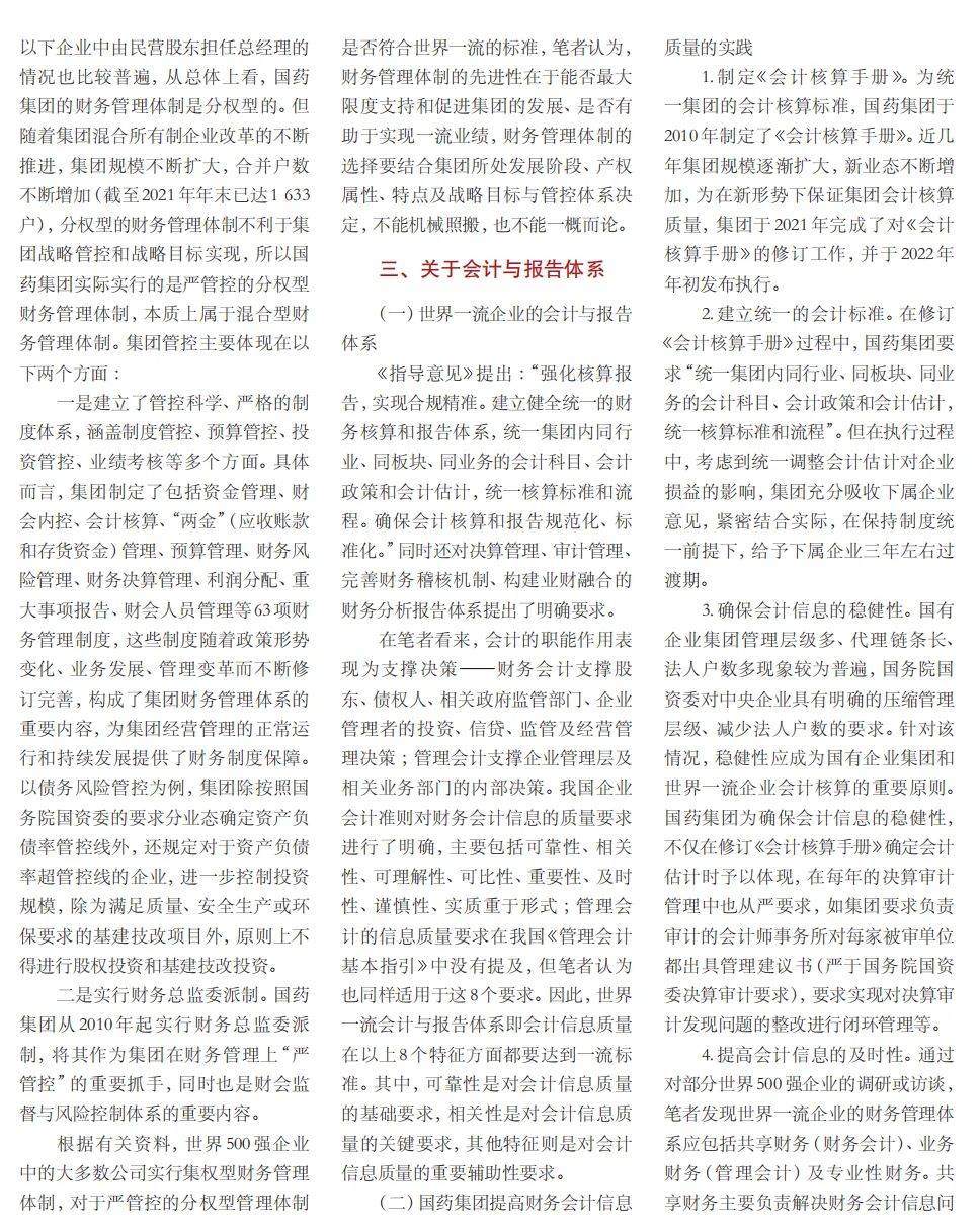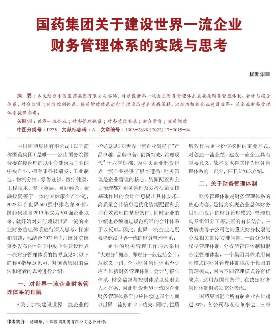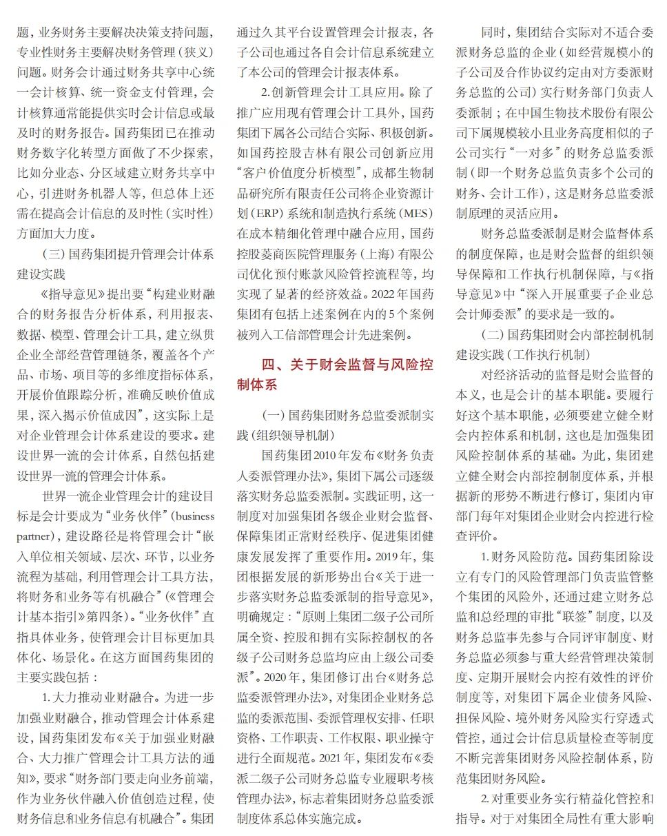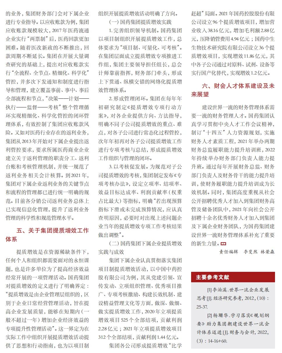 2022年2月,國務(wù)院國資委發(fā)布《關(guān)于中央企業(yè)加快建設世界一流財務(wù)管理體系的指導意見(jiàn)》,為中央企業(yè)進(jìn)一步提升財務(wù)管理水平提供了具體指引和行動(dòng)指南。中國醫藥集團有限公司(以下簡(jiǎn)稱(chēng)國藥集團)以建設 世界一流企業(yè)為目標,緊密結合集團管控和業(yè)務(wù)實(shí)際,構建并不斷優(yōu)化財務(wù)管理體制、會(huì )計與報告體系、財會(huì )監督與風(fēng)險控制體系,創(chuàng )新并持續完善獨具特色的提質(zhì)增效工作體系,取得了積極的成效。集團從“大財務(wù)”概念出發(fā),結合自身實(shí)際,對如何建設世界一流財務(wù)管理體系進(jìn)行理論思考與實(shí)踐闡釋?zhuān)淮罱ú⑼晟婆c集團相匹配的會(huì )計核算體系、會(huì )計制度管理體系、管理會(huì )計體系、會(huì )計信息質(zhì)量整改體系和會(huì )計信息質(zhì)量監督評價(jià)體系,不斷完善會(huì )計體系建設;針對集團應收賬款占比大的特點(diǎn),以“全流程、全節點(diǎn)、精細化、科學(xué)化”管控為核心原則,從“事前、事中、事后”全方位管控應收賬款,通過(guò)完善資信一體化平臺建設、建立客戶(hù)價(jià)值度分析模型、設置應收賬款專(zhuān)職管理機構及提升信息化管控手段等方式不斷提高應收賬款精細化管理水平;秉持“財務(wù)創(chuàng )造價(jià)值”理念,不斷強化業(yè)財融合,創(chuàng )新管理會(huì )計工具應用,在進(jìn)一步實(shí)現醫藥返利精準、高效核算的同時(shí),細化返利管理顆粒度,加速返利回收;通過(guò)財務(wù)總監委派制不斷強化對下屬企業(yè)的財會(huì )監督,加強財務(wù)管理,有效防范企業(yè)經(jīng)營(yíng)風(fēng)險和財務(wù)風(fēng)險;在對提質(zhì)增效的理論依據和邏輯進(jìn)行認真分析的基礎上,持續推動(dòng)并完善提質(zhì)增效項目制,以黨建引領(lǐng)作保障、以目標激勵促落實(shí) , 確保提質(zhì)增效做實(shí)做細取得實(shí)效。國藥集團開(kāi)展的一系列務(wù)實(shí)、創(chuàng )新的財務(wù)管理體系建設實(shí)踐對助力集團高質(zhì)量發(fā)展和創(chuàng )建世界一流企業(yè)發(fā)揮了重要作用, 希望能為相關(guān)企業(yè)集團加強財務(wù)管控和建設財務(wù)管理體系提供參考和借鑒。