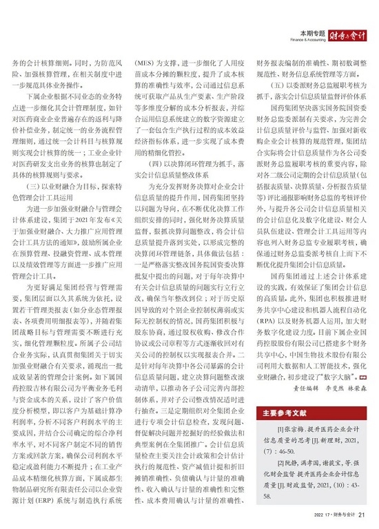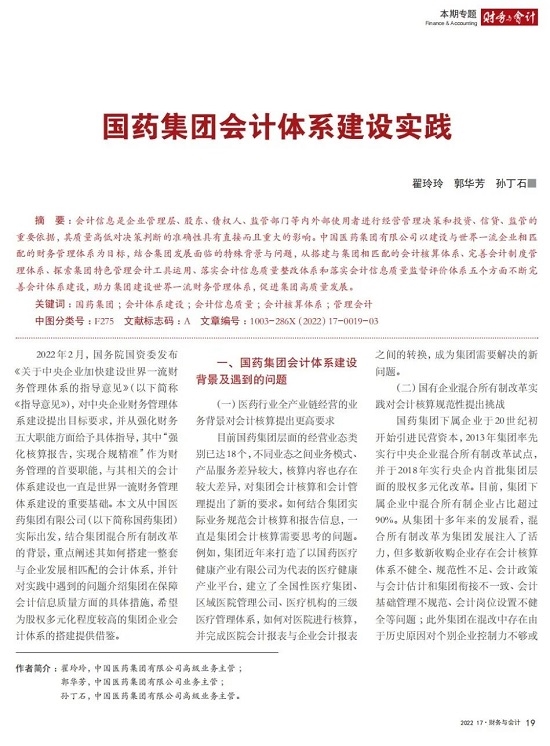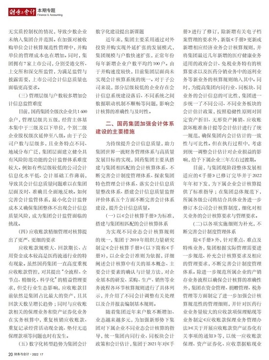 2022年2月,國務(wù)院國資委發(fā)布《關(guān)于中央企業(yè)加快建設世界一流財務(wù)管理體系的指導意見(jiàn)》,為中央企業(yè)進(jìn)一步提升財務(wù)管理水平提供了具體指引和行動(dòng)指南。中國醫藥集團有限公司(以下簡(jiǎn)稱(chēng)國藥集團)以建設 世界一流企業(yè)為目標,緊密結合集團管控和業(yè)務(wù)實(shí)際,構建并不斷優(yōu)化財務(wù)管理體制、會(huì )計與報告體系、財會(huì )監督與風(fēng)險控制體系,創(chuàng )新并持續完善獨具特色的提質(zhì)增效工作體系,取得了積極的成效。集團從“大財務(wù)”概念出發(fā),結合自身實(shí)際,對如何建設世界一流財務(wù)管理體系進(jìn)行理論思考與實(shí)踐闡釋?zhuān)淮罱ú⑼晟婆c集團相匹配的會(huì )計核算體系、會(huì )計制度管理體系、管理會(huì )計體系、會(huì )計信息質(zhì)量整改體系和會(huì )計信息質(zhì)量監督評價(jià)體系,不斷完善會(huì )計體系建設;針對集團應收賬款占比大的特點(diǎn),以“全流程、全節點(diǎn)、精細化、科學(xué)化”管控為核心原則,從“事前、事中、事后”全方位管控應收賬款,通過(guò)完善資信一體化平臺建設、建立客戶(hù)價(jià)值度分析模型、設置應收賬款專(zhuān)職管理機構及提升信息化管控手段等方式不斷提高應收賬款精細化管理水平;秉持“財務(wù)創(chuàng )造價(jià)值”理念,不斷強化業(yè)財融合,創(chuàng )新管理會(huì )計工具應用,在進(jìn)一步實(shí)現醫藥返利精準、高效核算的同時(shí),細化返利管理顆粒度,加速返利回收;通過(guò)財務(wù)總監委派制不斷強化對下屬企業(yè)的財會(huì )監督,加強財務(wù)管理,有效防范企業(yè)經(jīng)營(yíng)風(fēng)險和財務(wù)風(fēng)險;在對提質(zhì)增效的理論依據和邏輯進(jìn)行認真分析的基礎上,持續推動(dòng)并完善提質(zhì)增效項目制,以黨建引領(lǐng)作保障、以目標激勵促落實(shí) , 確保提質(zhì)增效做實(shí)做細取得實(shí)效。國藥集團開(kāi)展的一系列務(wù)實(shí)、創(chuàng )新的財務(wù)管理體系建設實(shí)踐對助力集團高質(zhì)量發(fā)展和創(chuàng )建世界一流企業(yè)發(fā)揮了重要作用, 希望能為相關(guān)企業(yè)集團加強財務(wù)管控和建設財務(wù)管理體系提供參考和借鑒。
