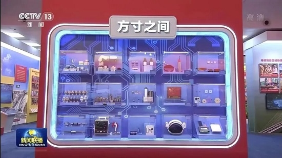 “方寸之間”展示臺擺放了國藥集團全球首個(gè)新冠滅活疫苗(頂層左一)。